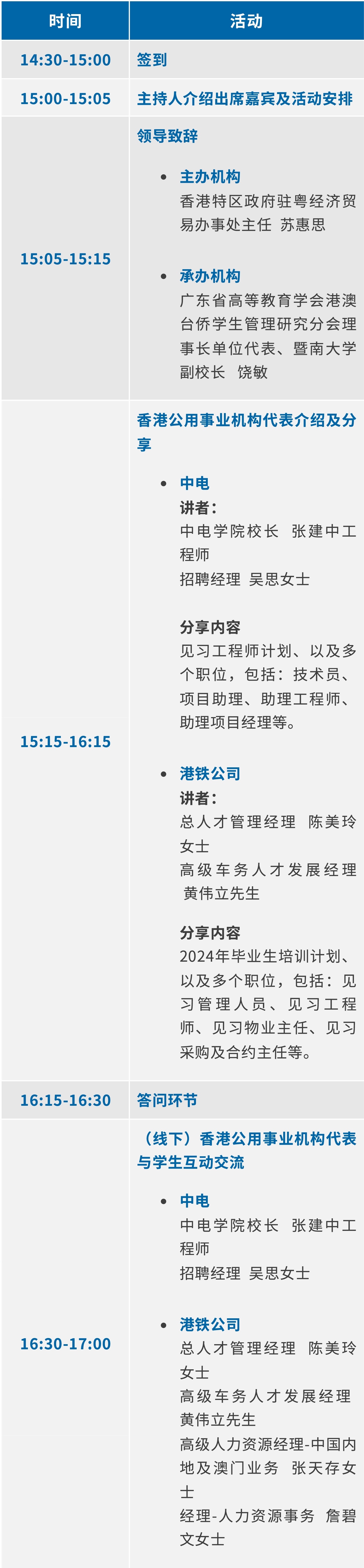 香港公用行状机构(如中电、港铁公司)在香港及内地均有业务,并为在内地就读港生提供职责契机。为了让同学们愈加意志香港公用行状机构的运作和东说念主才需求,驻粤办邀请中电和港铁公司的机构代表,通过先容其业务规模、用东说念主需求,以及与出席同学互动疏通,让同学们了解香港公用行状机构的具体职责情况和行状发展契机,便利群众提前作念好职业谋划。在行为上,中电和港铁公司两家机构,将会为同学们带来不同职责岗亭的招聘信息。接待对香港公用行状机构赴任契机和报考感兴味的同学,参加本次共享会行为。 www.majesticathleticpro.com皇冠注册